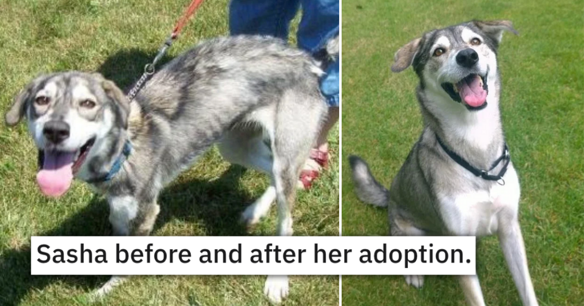 includes-before-and-after-photos-of-a-rescued-husky-named-sasha-sasha-before-and-after-her-adoption