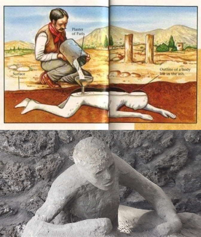 Human remains in Pompeii are not petrified bodies, they're made out of plaster that's been poured into the molds that the decayed bodies left in the volcanic ash. There are mostly skeletons in them but the rest is plaster.